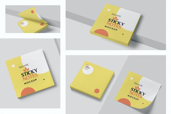 Square shaped sticky note pad mockups to help you showcase your designs with 4 different views. You can easily add your text messages, corporate identity or office stationery branding designs to these mockups using smart object option. These mockups also allow you to change the color, effects, shadows and background using well-named layers.