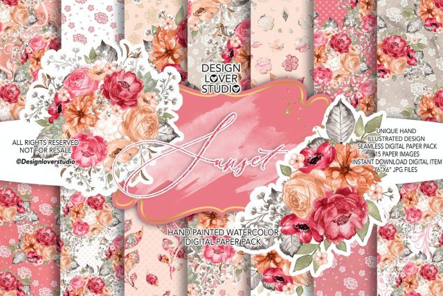 Watercolor Sunset digital paper pack, summer, autumn watercolor flower, Pink blush Floral background, Wedding pattern, wedding, Rose blush,