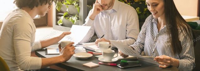 Business partners working during business lunch panorama