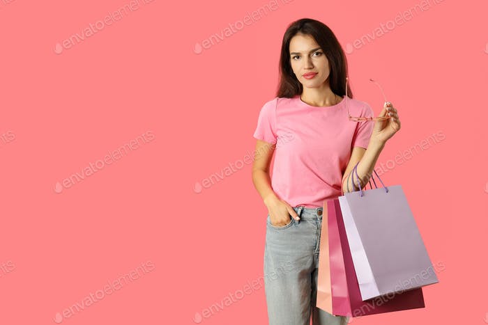 Attractive girl with multicolored paper bags on pink background