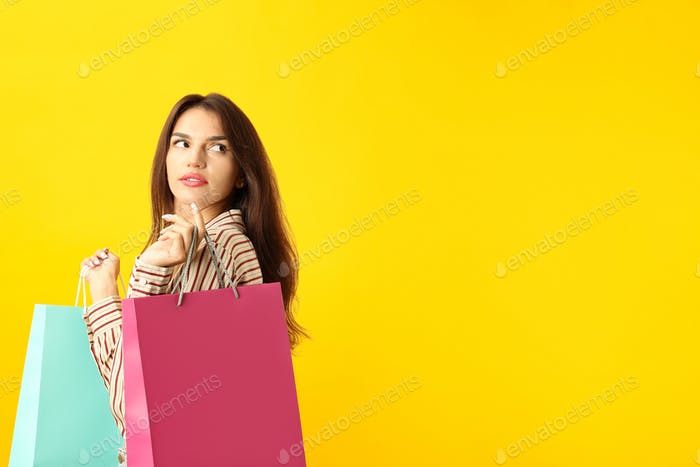 Attractive girl with multicolored paper bags