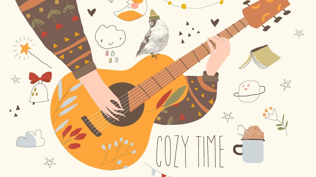 Cartoon Hands playing Guitar. Autumn Mood. Vector