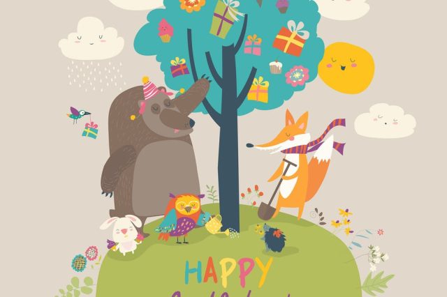 Cartoon animals celebrating Birthday in the forest