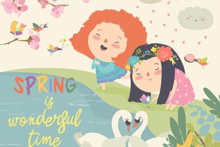 Cute little girls and birds playing in the spring