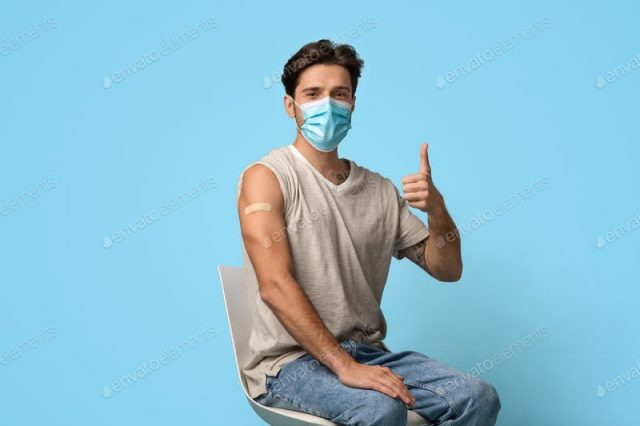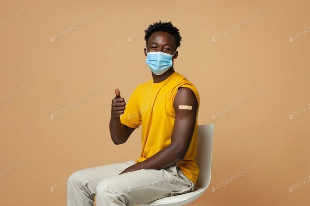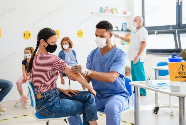Child with face mask getting vaccinated coronavirus covid-19 and vaccination concept