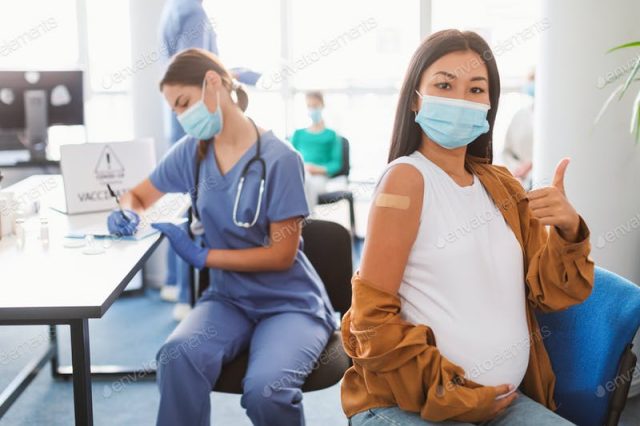 Vaccinated Pregnant Asian Lady Gesturing Thumbs-Up At Clinic