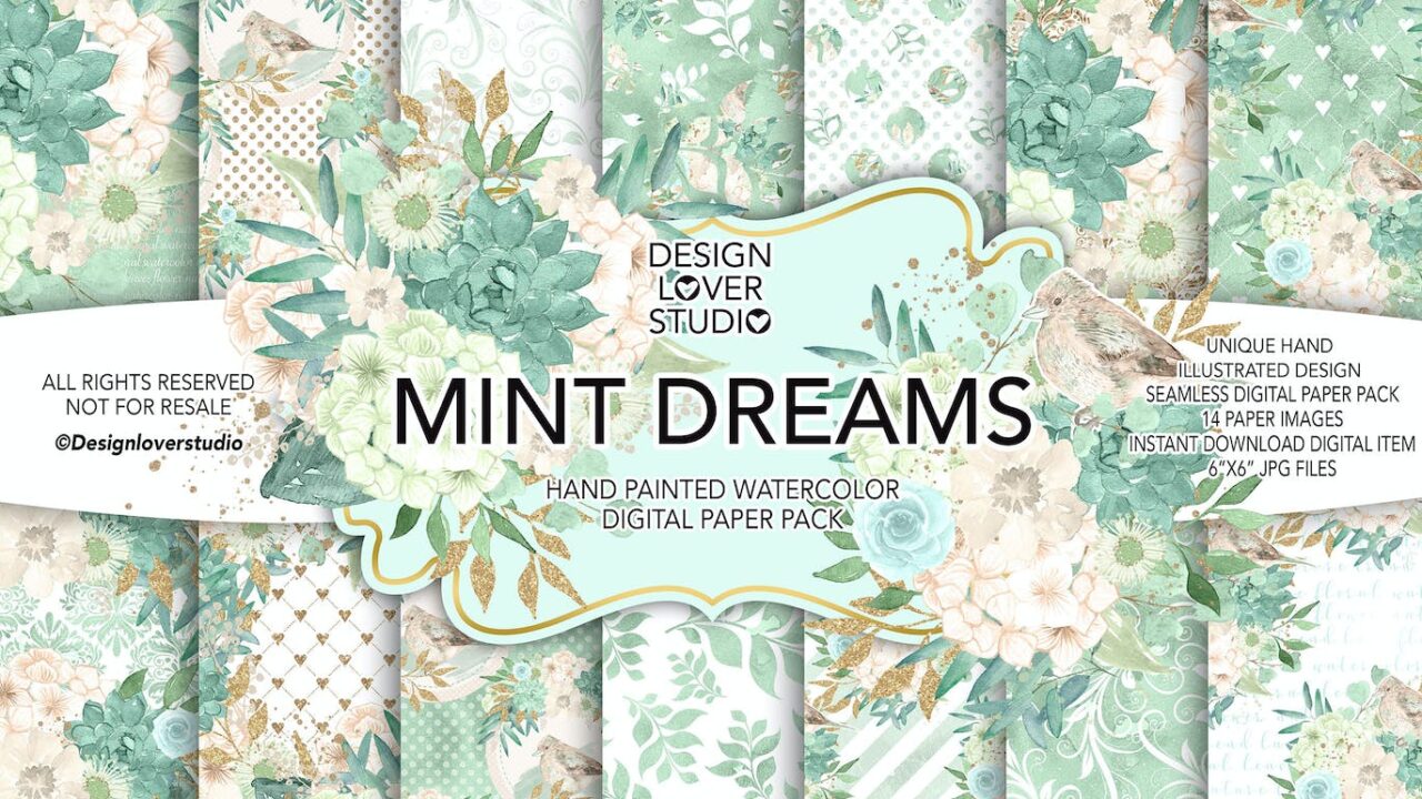 Watercolor MINT DREAM digital paper pack