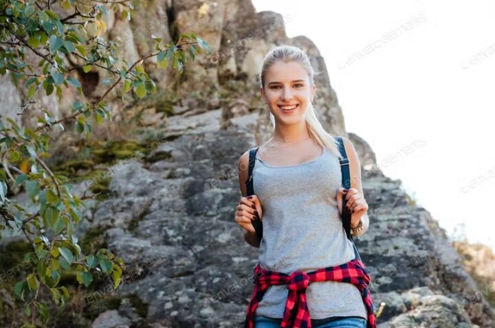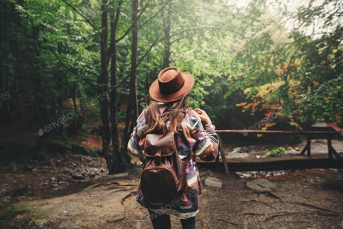 Stylish hipster girl in hat traveling in mountains