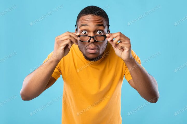Shocked African Guy Looking At Camera Through Eyeglasses Blue Background