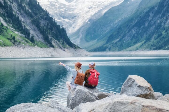 Portrait of a woman holding her man’s hand while walking along a mountain range vertical photo