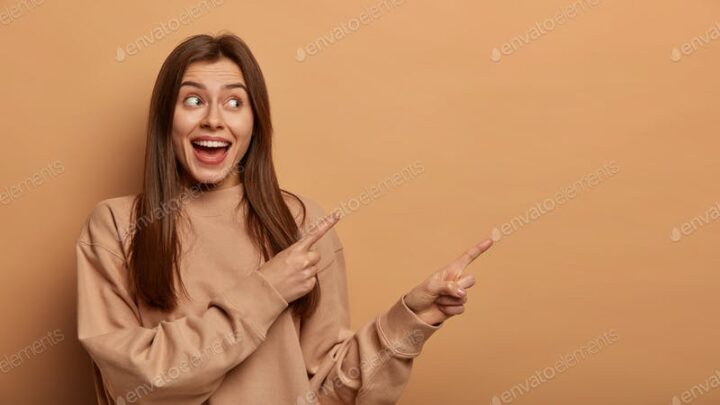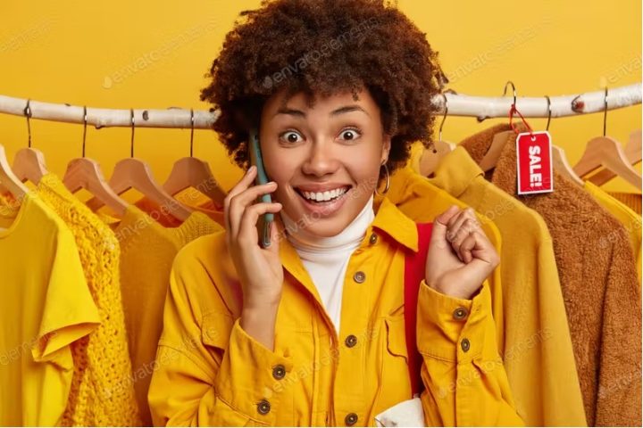 Joyful curly woman with overjoyed face expression broad smile raises clenched fists phones someon
