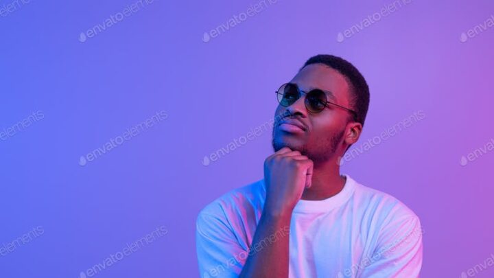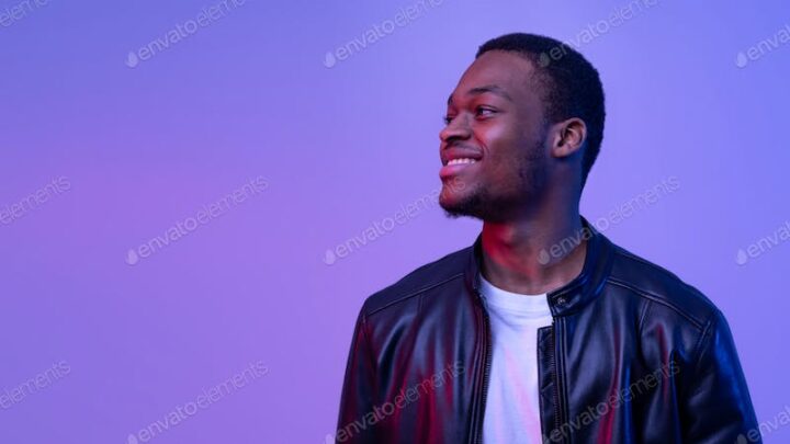 Smiling Attractive Black Guy In Stylish Leather Jacket Looking Aside With Interest