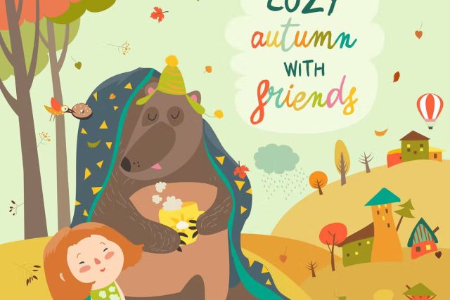 Little girl and bear sitting under plaid