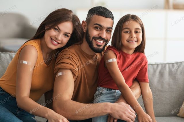 Child with face mask getting vaccinated coronavirus covid-19 and vaccination concept