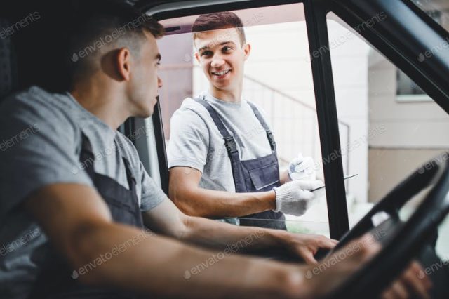 A young handsome guy wearing uniform is looking out of the car window Another worker wearing