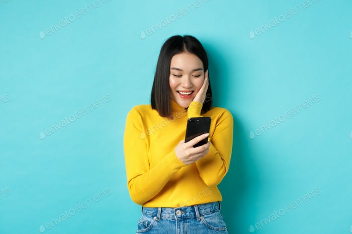 happy asian woman reading message on mobile phone