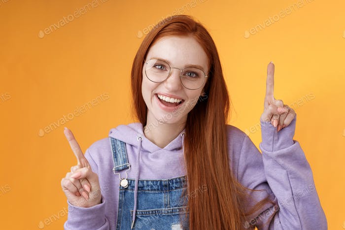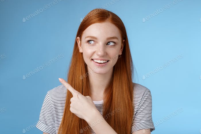 Redhead joyful curious girl watching looking