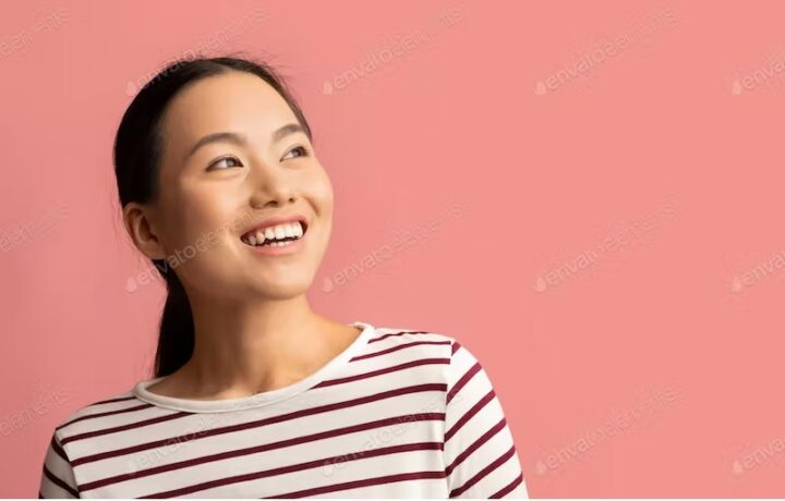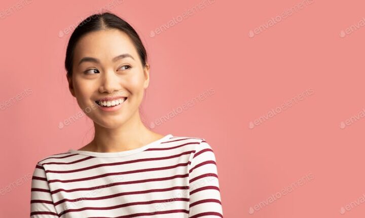 Portrait Of Excited Young Korean Woman Looking At Copy Space With Interest