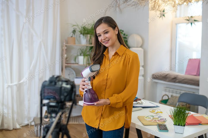 Joyful nice woman advertising a steamer