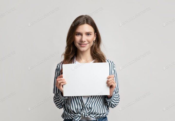 Portrait of beautiful woman holding white blank advertising board