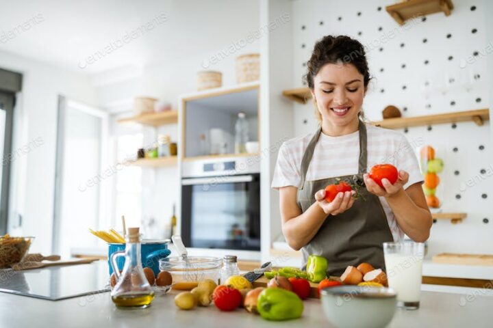 Happy woman making healthy food standing smiling in kitchen preparing food