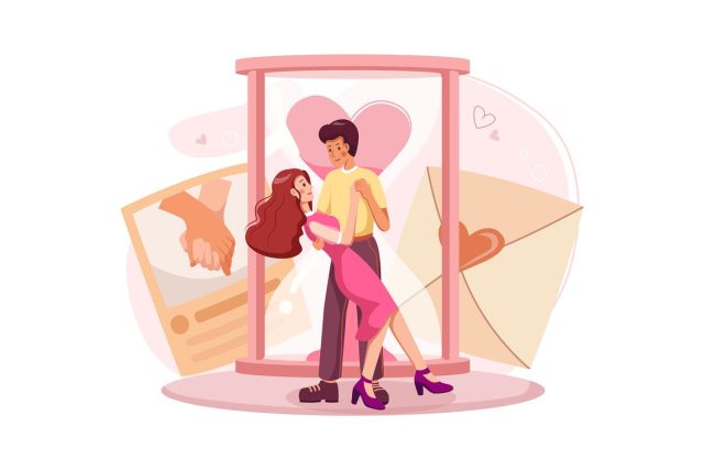 Cartoon happy couple in love kissing surrounded by
