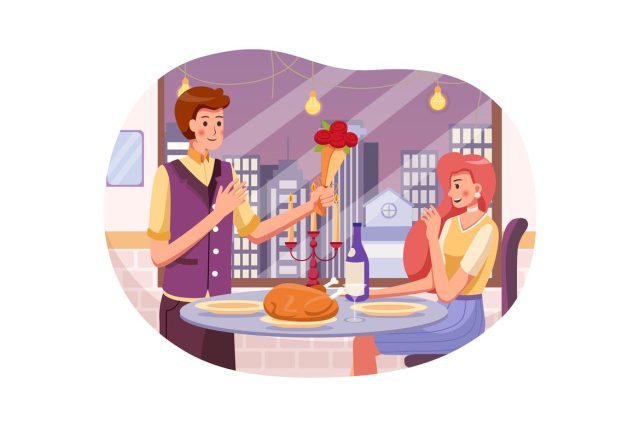 Man in suit gives a bouquet of roses to woman