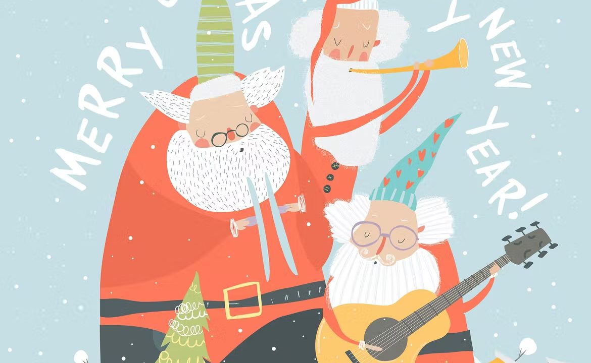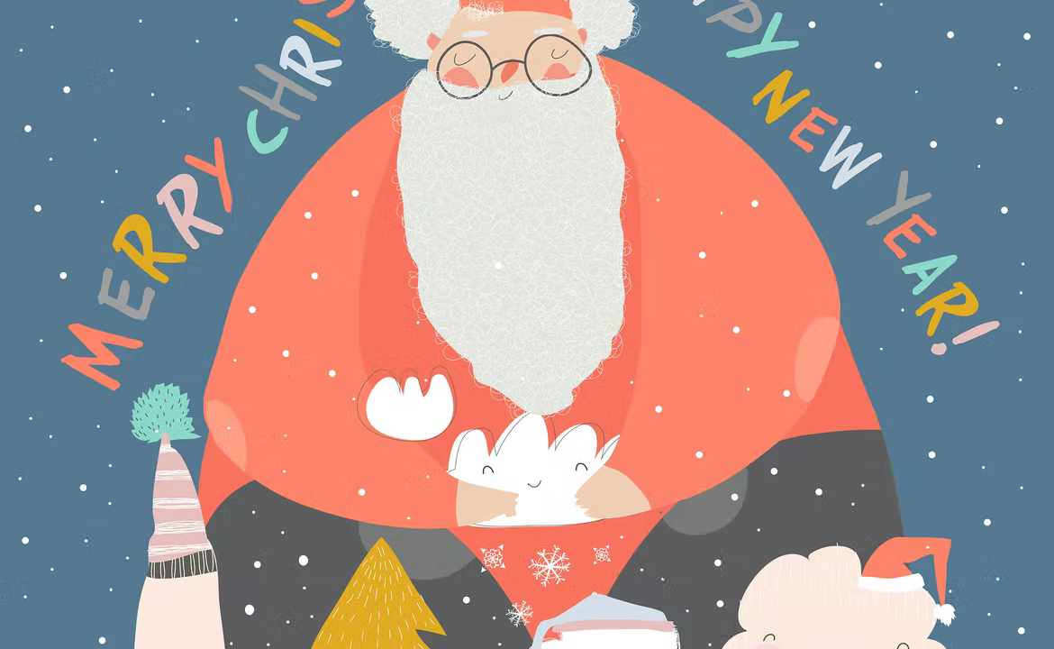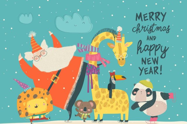 Cartoon Santa Claus with gifts sitting on dinosaur