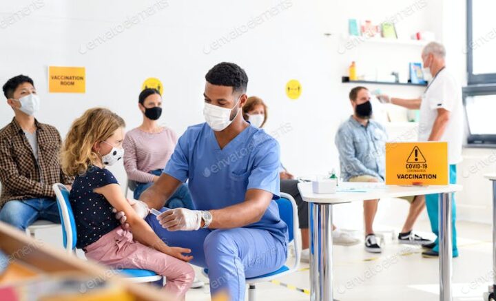 Child with face mask getting vaccinated coronavirus covid-19 and vaccination concept