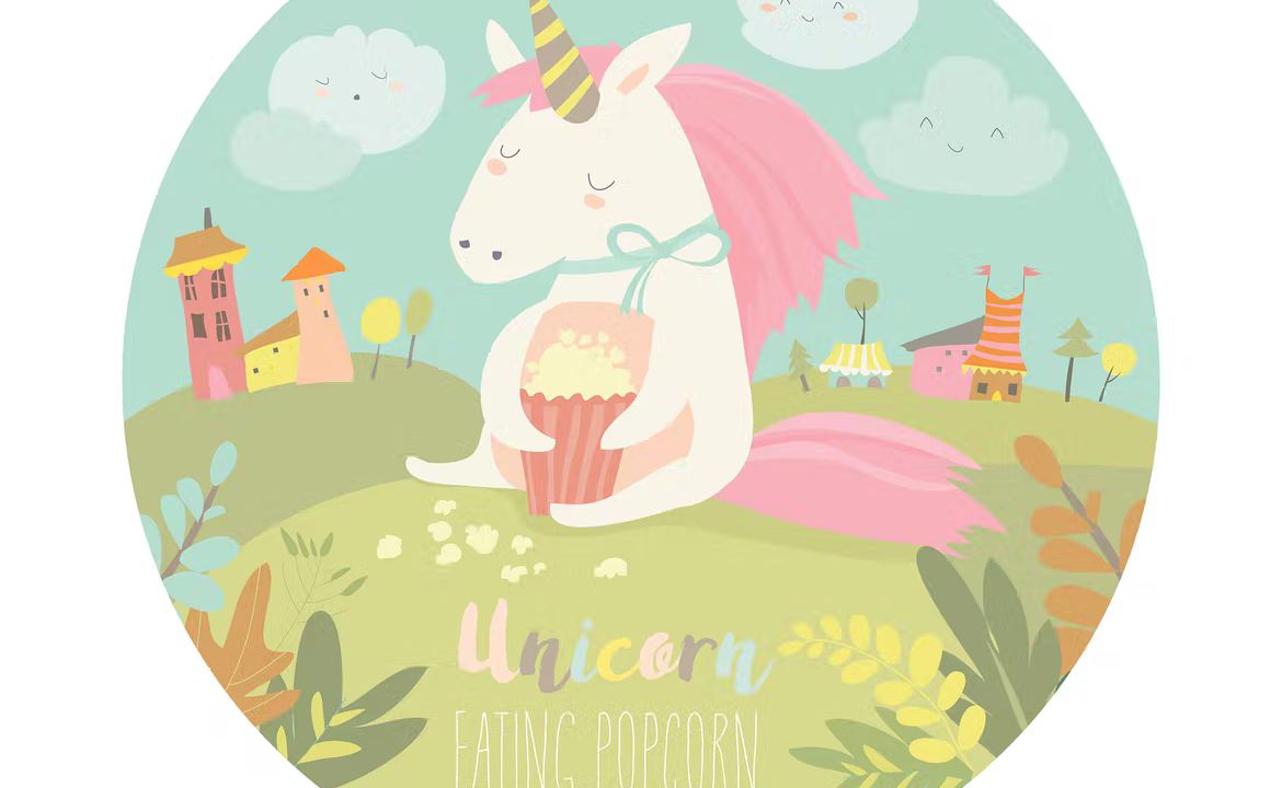 Little cute unicorn eating popcorn. Vector