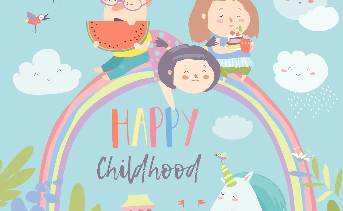 Happy kids on rainbow with magical unicorns.