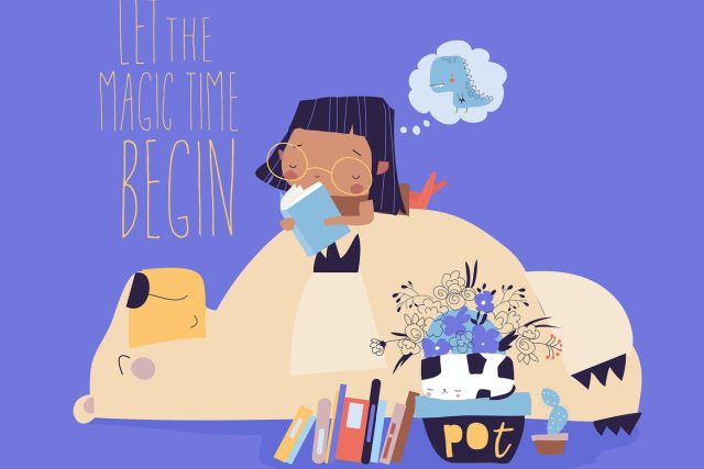 Cute cartoon girl reading book with bear Vector