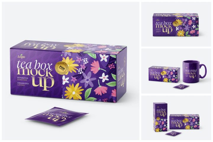 New amazing Tea Box and Tea Bag Packaging Mockup Set with 4 scenes, 4k backgrounds, and trendy packaging design. This mockup bundle includes a total of 4 packaging mockups that can use for tea packaging and branding designs.