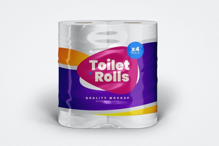 On this PSD mockup, you can find a pack of toilet paper rolls, packaged in clear plastic with the design on top of it. This mockup was created with editability in mind, this is achieved by utilizing well-organized layers and smart objects. You can customize this mockup to accurately reflect your brand or business.