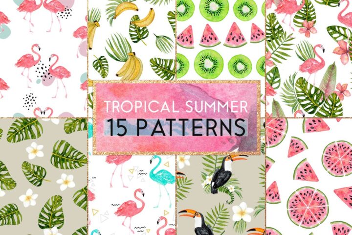 Hello! I created for you a collection of summer tropical patterns. 15 different designs and lots of color combinations! Pick a color for your design and use it in your project 🙂
