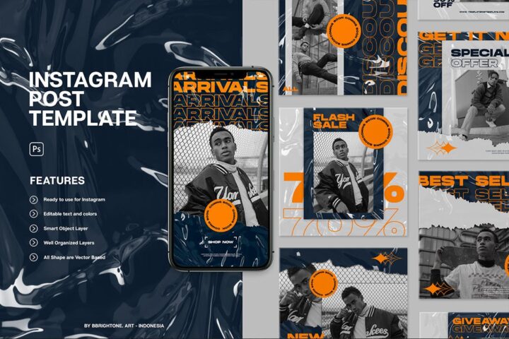 Ready to use for Instagram 12 Sizes of social media Instagram Post Template. Easy image placement via smart objects. Fully layered & well organized High resolution Free fonts used All shapes are vector based. Editable text and colors