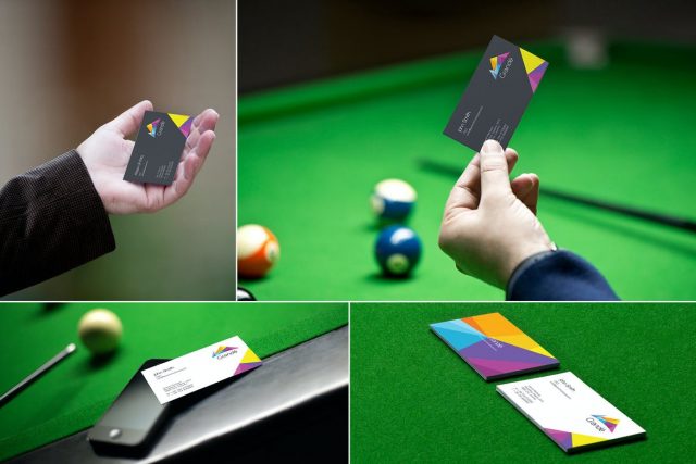 Use these photorealistic visiting card mockups and present your designs with hand holding positions and beautiful pool table background. These mockups offer 4 PSDs having amazing light effects and realistic shadows plus smart object option that allows you to replace the design with a single click.