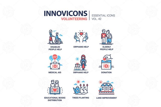 Volunteering – modern vector line design icons set. Disabled people, orphans, elderly, senior help, medical aid, donation, educational books distribution, tree planting, land improvement.
