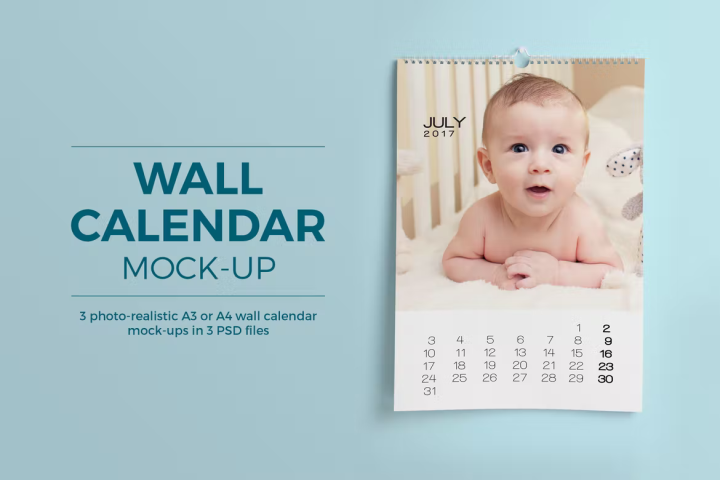 3 photo-realistic A3 or A4 wall calendar mock-ups in 3 PSD files. Save time and use this photo-realistic mock-up instead of taking pictures. It’s very easy to use.