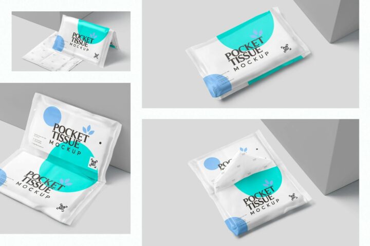 Create beautiful presentations of your pocket tissue paper packaging designs using these wallet style tissue pack mockups. These packaging mockups have customizable design on each visible side of the tissue pack. You can easily adjust the light effects, shadows and background using these intelligent layers.