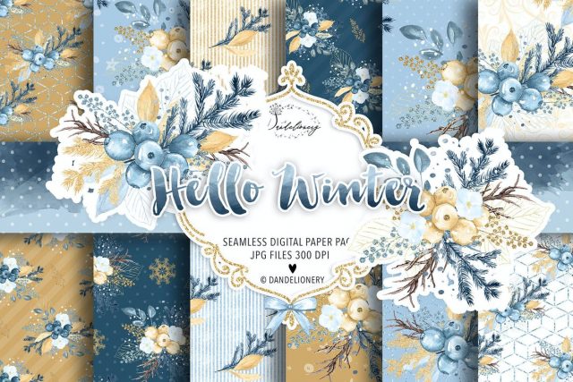 Watercolor Hello Winter digital paper pack, christmas, branches, christmas pattern, winter mood, snowflakes, holiday, snow, winter, star