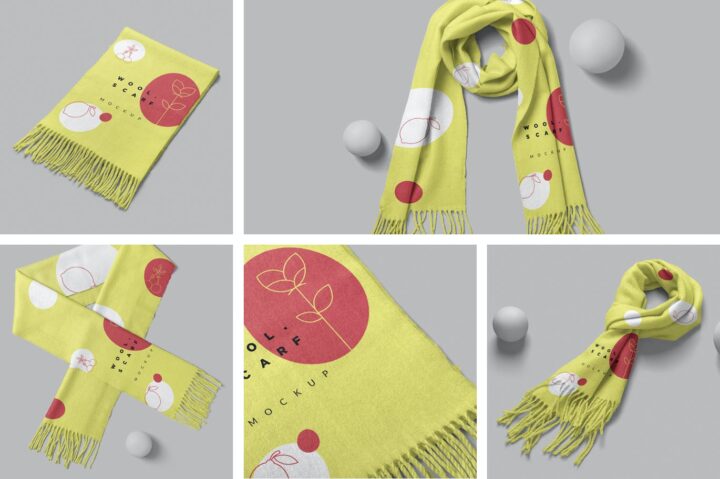 These winter scarf mockups are a great addition to female apparel branding designs. Offering different styles of neck woolen scarf with easy to replace design options. These mockups can be used to show your beautiful color, patterns and apparel branding designs. All mockups are placed on customizable background which you can easily replace with your own.