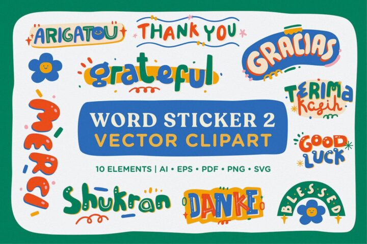 Contains with many cute objects such as thank you sticker, gracias, arigatou, terima kasih, good luck sticker, grateful, merci, shukran, danke, blessed, etc…