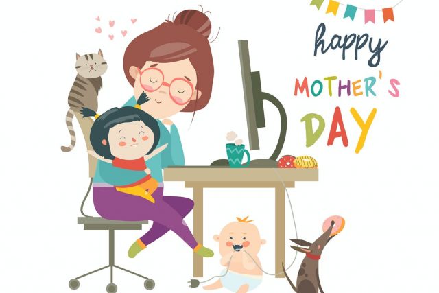 Working at home mother, freelancer with two kids. Tired and annoyed. Vector illustration