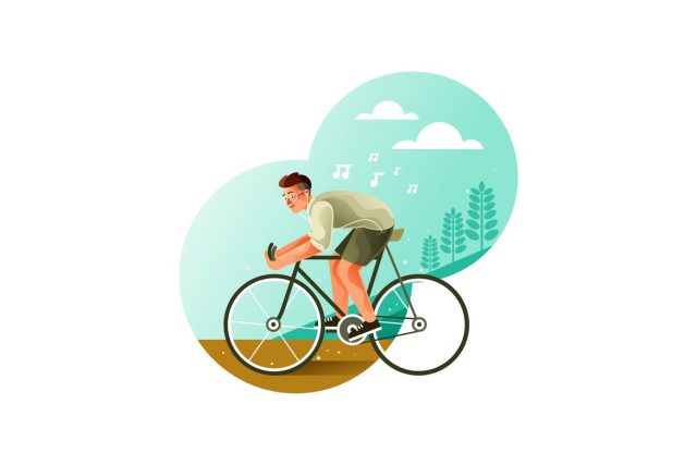 Youth riding a bicycle while listening to music with a New Cartoon Style Vector Illustration